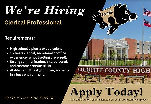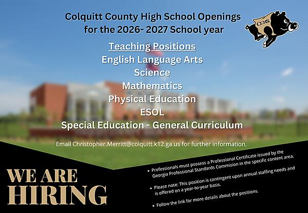 Openings include English Language Arts, Mathematics, Science, Physical Education, ESOL, Special Education - General Curriculum, MCJROTC Instructor and Clerical Professional.