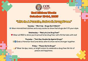 We will have Red Ribbon Week on October 21-24. Tuesday – “Mix It Up – Drugs Don’t Match...