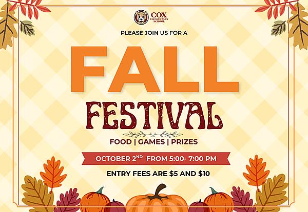 Cox Elementary school will have a fall festival on October 2nd from 5:00-7:00. There will be a lot of fun games, prizes, a mystery hallway and delicious food!! The entry fee is $5 or $10 and tickets can be purchased in advance or at the festival. We hope to see you there!!