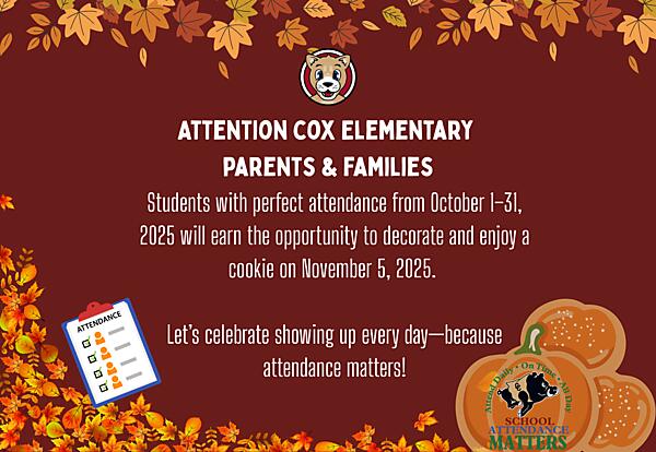 We will have a fun reward for students who have perfect attendance for the month of October! Students who have been here every day will get to decorate and eat a cookie on November 5th. Lets celebrate showing up every day because attendance matters!!