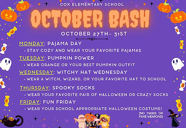 Friday: fun Friday- wear your school-appropriate Halloween costume! (no masks or fake weapons)