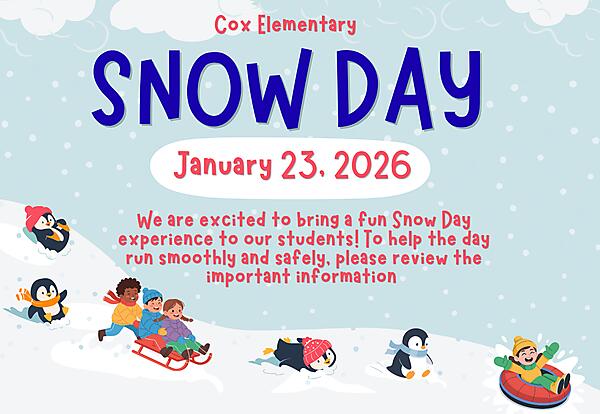 Cox Elementary snow day will be this Friday, January 23rd. Please read all the information below to ensure our snow day runs smoothly.