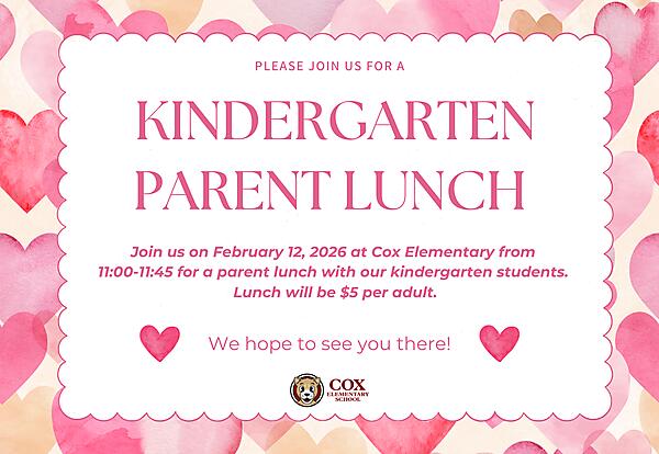 Join us on February 12, 2026 at Cox Elementary from 11:00-11:45 for a parent lunch with our kindergarten students. Lunch will be $5 per adult.
