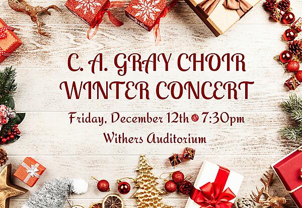 Come enjoy the sounds of the season with the C. A. Gray Choir on Friday, December 12th at 7:30pm! Tickets are $5 each and may be purchased at the door.