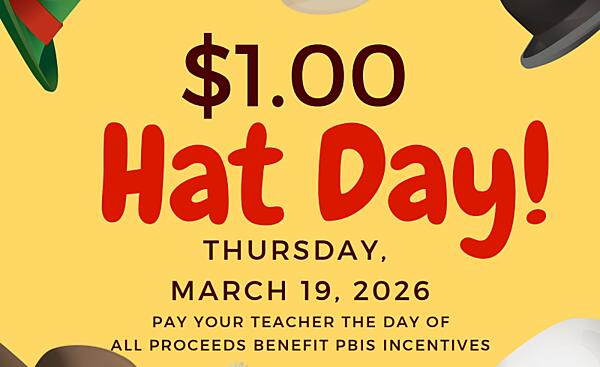 Hat Day is this Thursday, March 19th! Bring $1 and wear a hat. Proceeds benefit the PBIS store.